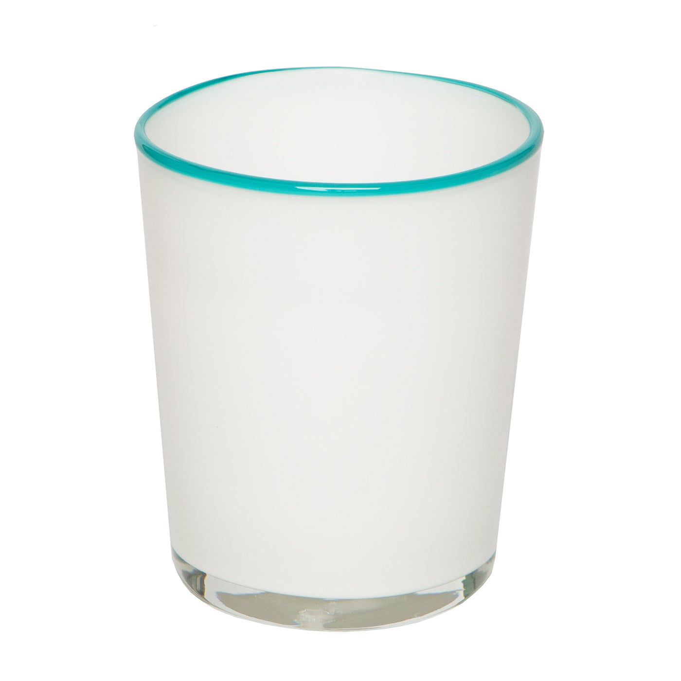 Each tumbler is lightly frosted, resembling sea glass and features a contrasting colored rim. Serve up a little summer with this artfully designed glassware selection.