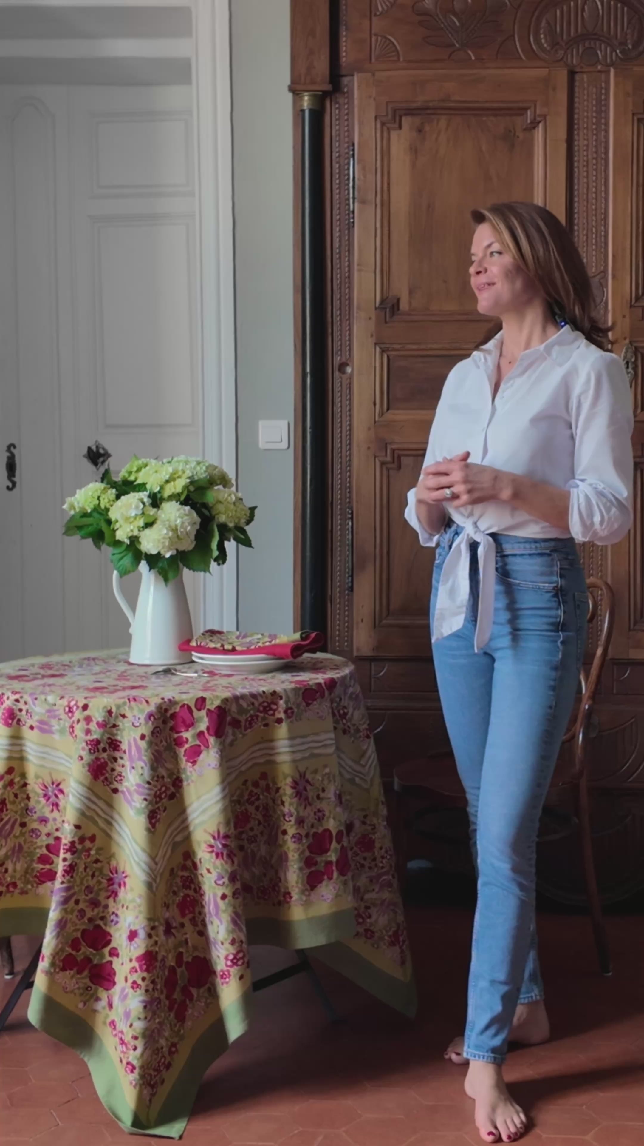 The vibrant watercolors of this French linen will enliven any room or outdoor table with a sense of understated beauty and style, whether in spring, summer , or beyond. This tablecloth — available in round, square, and rectangle shapes — has been carefully handprinted by skilled artisans using a time-honored technique, resulting in a singular piece of craftsmanship.