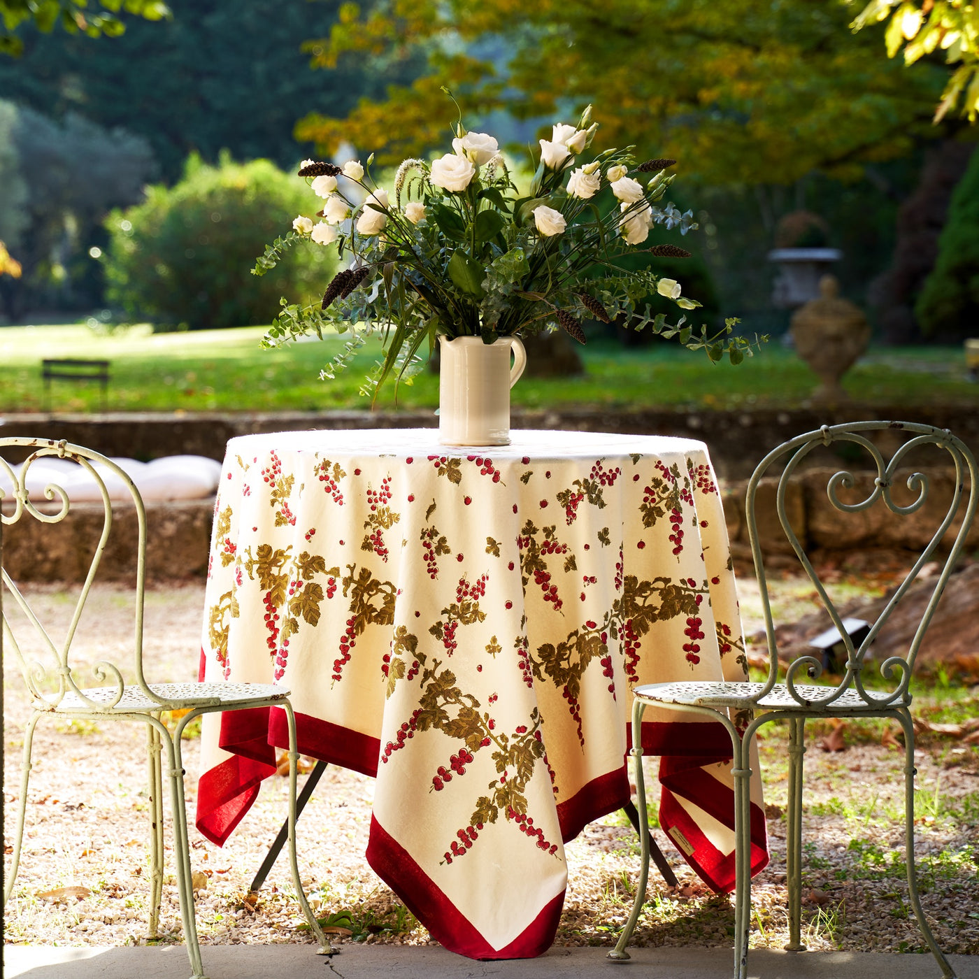 With rich vermilion and mossy green designs set against a simply ivory background, the Gooseberry tablecloth makes a fittingly cozy backdrop for a meal, whether a wintertime feast or a simple gathering any time of the year. This elegantly simple pattern adds a bit of understated beauty to your table setting, and each of these French linens has been carefully handprinted by skilled artisans using a time-honored technique, resulting in a singular piece of craftsmanship.