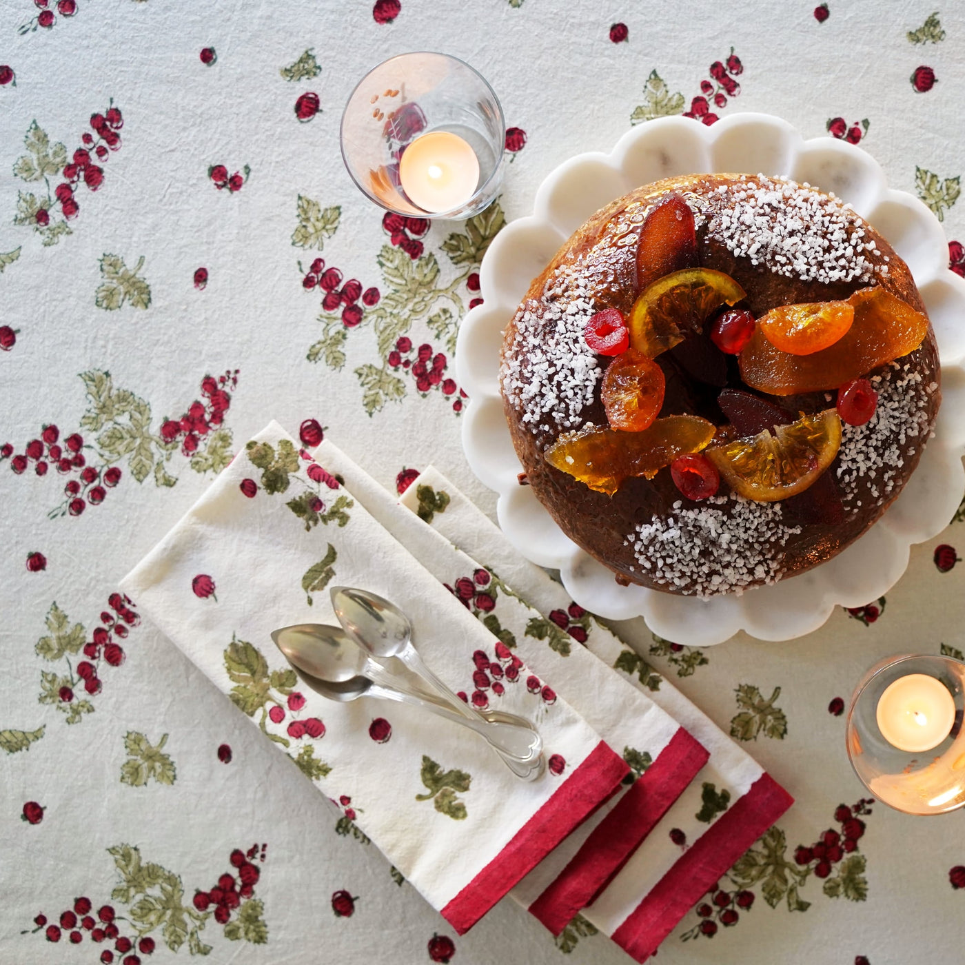 With rich vermilion and mossy green designs set against a simply ivory background, the Gooseberry tablecloth makes a fittingly cozy backdrop for a meal, whether a wintertime feast or a simple gathering any time of the year.