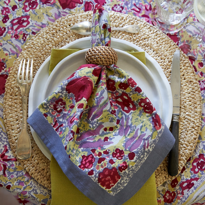The bright watercolors in these table linens, runner and tea towels are ideal year round for family dining, a picnic or the breakfast nook. Fine French table linens, hand-printed.  A fine linen cloth napkin transforms the ordinary meal into a dining experience and makes guests feel cared for, adding an extra element of polish to any occasion.